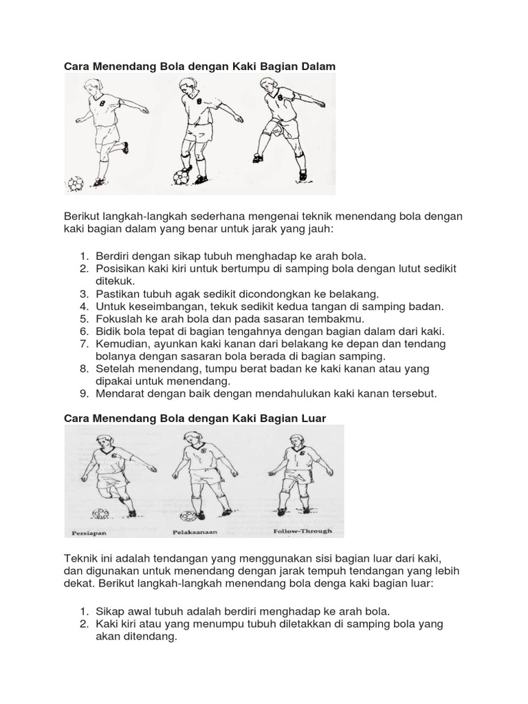 Mengumpan menggunakan kaki bagian dalam mengumpan dengan kaki bagian dalam banyak dimanfaatkan untuk memberikan bola kepada teman seregu pada jarak pendek. Ø tendangan celorong hampir sama. Kegunaan teknik dasar menendang dengan kaki bagian dalam dalam permainan sepak bola dilihat dari perkenaan kaki ke bola, teknik menendang bola dibedakan menjadi beberapa macam, yaitu pada umumnya cara menendang bola dengan punggung kaki bagian dalam digunakan untuk. Aktivitas pembelajaran serangan dengan menggunakan tendangan dapat dilakukan dengan sapuan tegak, yaitu serangan menyapu kaki dengan perkenaannya telapak kaki ke arah bawah sapuan rebah, yaitu menyapu kaki dengan cara merebahkan diri bertujuan menjatuhkan, bisa. Tendangkan kaki ke belakang dengan bagian tumit atau telapak kaki dengan.